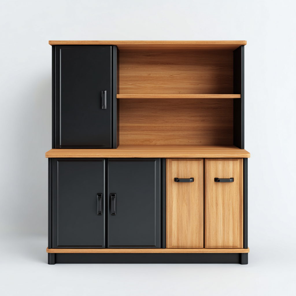 Questo armadietto da cucina combina una struttura compatta con una disposizione funzionale, ideale per organizzare utensili, stoviglie e accessori da cucina. Il design con ripiani aperti e vani chiusi consente un utilizzo flessibile dello spazio, adattandosi perfettamente a cucine moderne e ambienti domestici contemporanei.