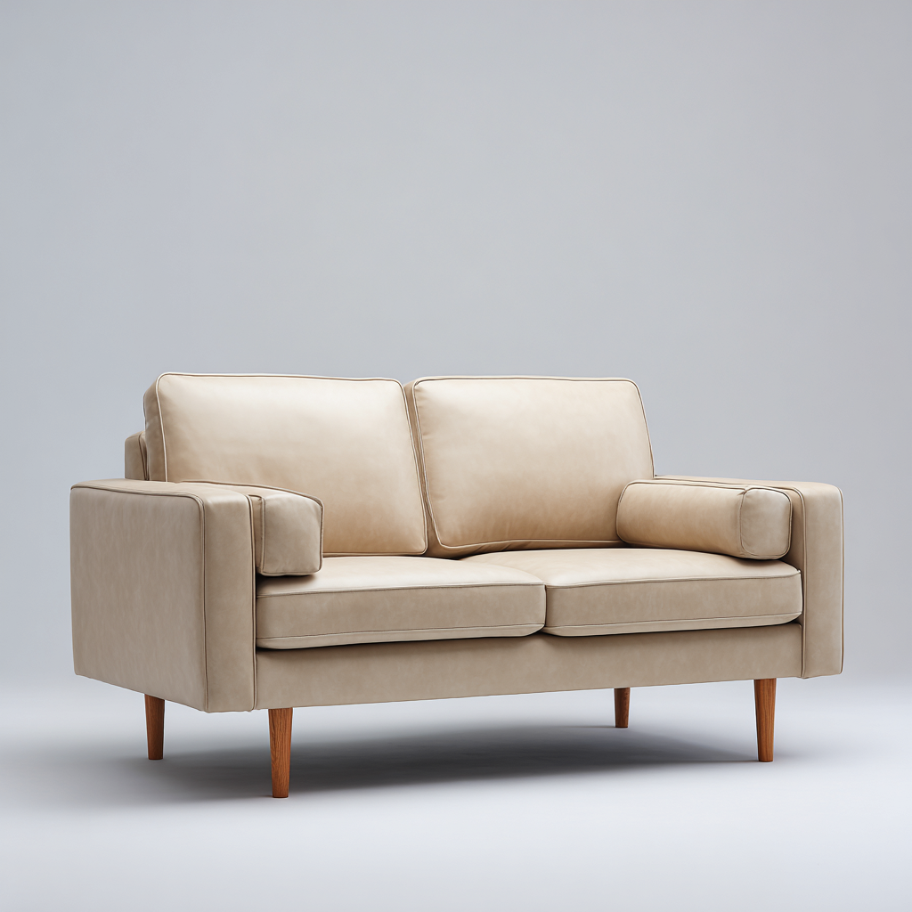 Il rivestimento è realizzato in pelle di colore beige con finitura morbida e uniforme. La struttura interna assicura stabilità e durata nel tempo, mentre i piedini in legno conferiscono un tocco caldo e naturale all'insieme.