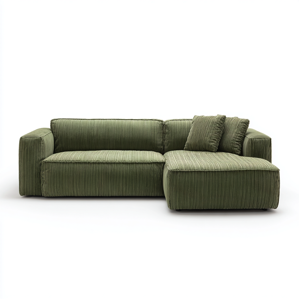 Il rivestimento è realizzato in tessuto a coste di colore verde, piacevole al tatto e resistente all'uso. La struttura interna è solida e ben bilanciata, mentre l'imbottitura garantisce una seduta stabile e uniforme.