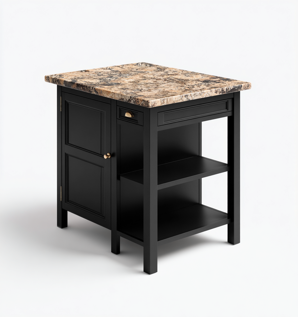 Questa isola da cucina compatta è progettata per offrire una superficie di lavoro stabile e uno spazio di supporto funzionale, ideale per cucine domestiche che richiedono praticità e ordine.