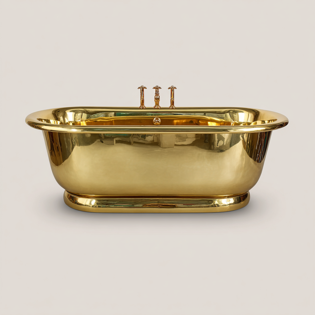 La vasca è realizzata in ottone con finitura color oro lucido. La lavorazione accurata garantisce una struttura solida, una superficie liscia e una resa estetica di alto livello, ideale per bagni in stile classico o luxury.