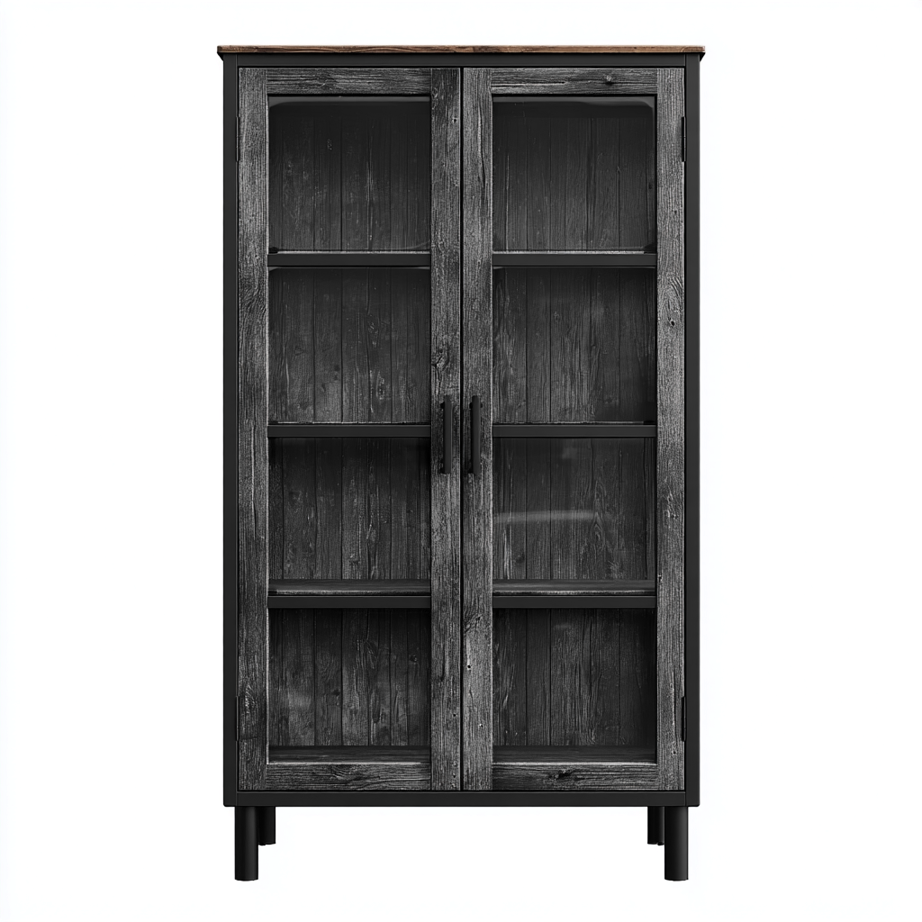 La struttura combina legno con finitura grigio scuro effetto invecchiato e un telaio di supporto robusto. Le ante frontali sono dotate di pannelli in vetro trasparente che valorizzano il contenuto mantenendo un aspetto autentico e materico.