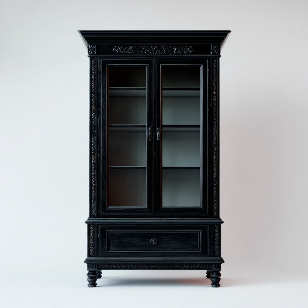 La struttura è realizzata in legno con finitura nera profonda, arricchita da dettagli decorativi intagliati. Le ante frontali sono dotate di pannelli in vetro trasparente che valorizzano il contenuto interno mantenendo una buona protezione.